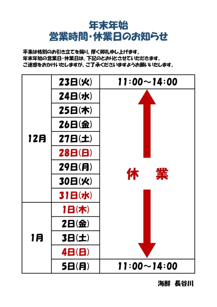 年末年始の営業時間・休業日は、下記のとおりとさせていただきます。